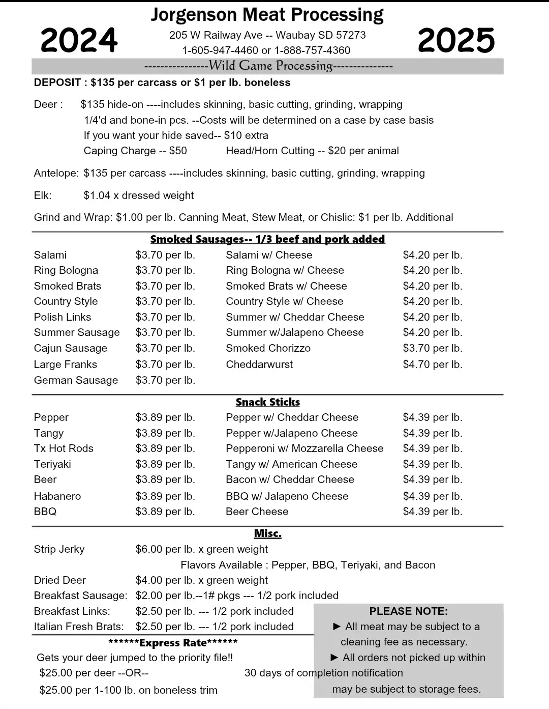 We take in a large amount of wild game to process every year, so it does take a bit of time to get your finished product back. Be patient and we think you will be happy with what we do. Or, if patience isn’t your strong point, you can go with our Express Fee! For an extra fee, your wild game order will be pushed to the front of the line, behind only the Express Orders that came in ahead of you.